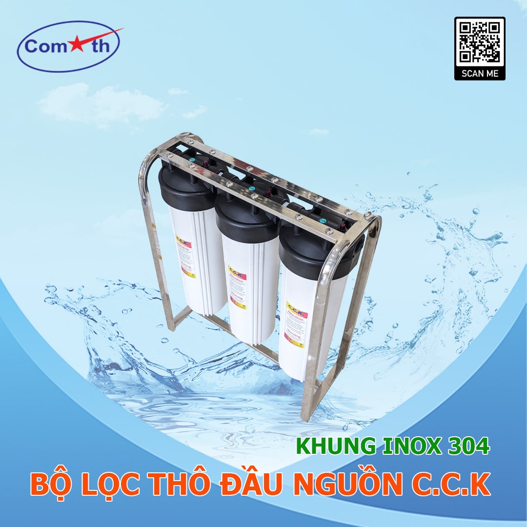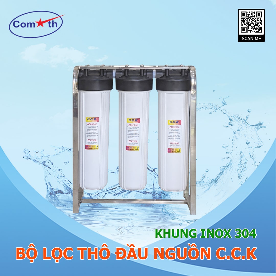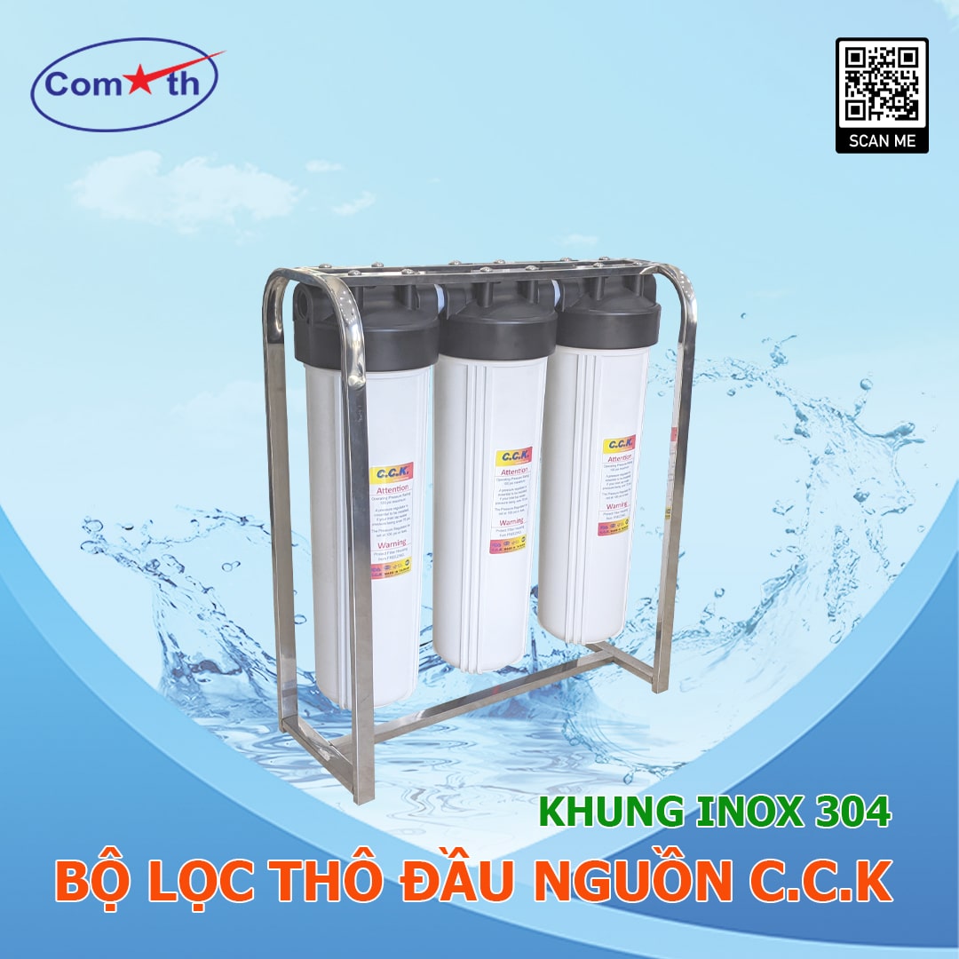 Bộ lọc thô đầu nguồn 3 cấp C.C.K khung inox thiết kế với chức năng chính loại bỏ các tạp chất cặn bẩn lơ lửng trong nước, hấp thụ khử, mùi vị, chất hữu cơ, thuốc trừ sâu, chất diệt...