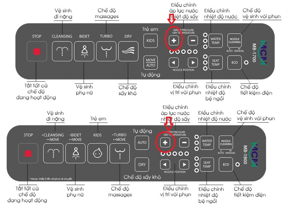 - Do tùy chọn áp lực nước thấp: Bạn điều chỉnh áp lực nước bằng cách nhấn nút (+) ở WATER PRESSURE trên bảng điều khiển