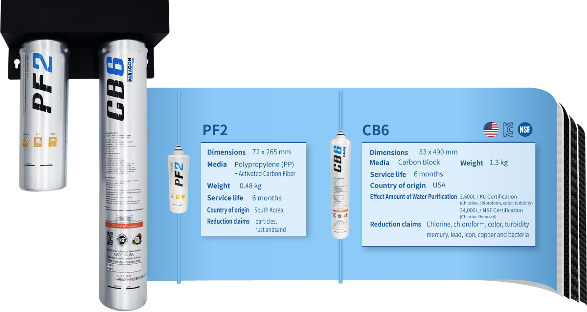 Lõi lọc PF2 được lắp đặt trước CB6 hoặc SR6 qua đó tối ưu hiệu suất và tuổi thọ của lõi