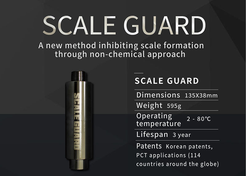 Scale Guard: Thiết bị chống cáu cặn cấu tạo là 2 cực nam châm đặc biệt tạo dòng xoáy hút chặn kim loại (Fe, Ca, Mn, Mg,..) hay phi kim (nitơ, muối…) tồn tại trong nước, đồng thời nước được phân tách Ca2+ , H+ và OH- qua đó tạo thành chất kết bông hạn chế đóng cặn
