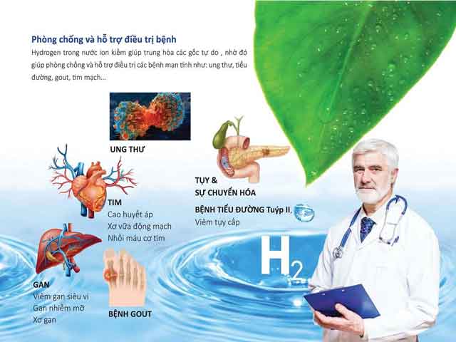 Tuy nhiên, với nước giàu hydrogen, cơ thể con người sẽ được bảo vệ toàn diện, nuôi dưỡng từ bên trong. Nước ion kiềm trung hòa axit, hydrogen chống oxy hóa và các gốc tự do. Qua đó, ngăn ngừa và hỗ trợ điều trị nhiều bệnh tật như: Béo phì, tăng huyết áp, tăng đường huyết, bệnh tim, ung thư…
