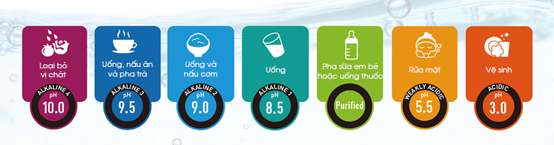 - Kiềm cấp độ 1 (pH 8.5) nước uống cho người mới bắt đầu - Kiềm cấp độ 2 (pH 9.0) nước uống và nấu cơm - Kiềm cấp độ 3 (pH 9.5) nước uống, pha trà,nấu súp và hầm - Kiềm cấp độ 4 (pH 10.0) đây là nước kiềm mạnh, giúp rửa rau củ quả sạch hơn, an toàn hơn, loại bỏ vị chát.
