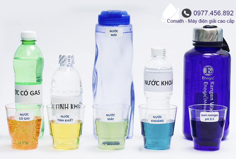 Nước Hydrogen có tính kiềm vượt trội hơn các loại nước khác, từ trái sang phải: nước ngọt có gas - nước tinh khiết - nước máy - nước khoáng - nước Kangen pH >=9.5