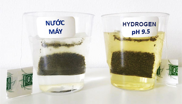 Nghiệm pha trà ở nhiệt độ thường, bên trái là ly nước máy, bên phải là ly nước Hydrogen pH = 9.5. Ly nước Kangen có màu vàng đậm hơn hẳn và chiết xuất ra nhiều mùi trà, rất thơm.