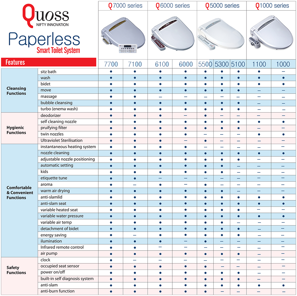 Bảng so sánh tính năng giữa các model thiết bị vệ sinh cao cấp Quoss