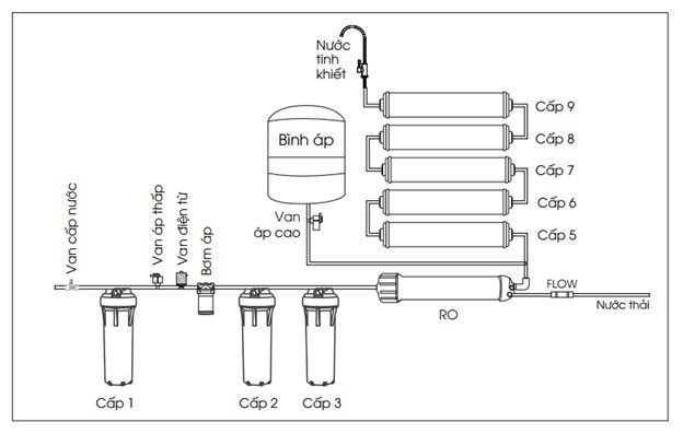 Sau khi qua bước lọc thô, nước tiếp tục được hút qua van điện từ đi vào bơm. Bơm có tác dụng hút nước đẩy lên màng lọc RO. Màng RO có khe lọc siêu nhỏ 0.0001 micron. Ở đây, màng RO sẽ loại bỏ hầu như hoàn toàn các tạp chất siêu nhỏ, vi khuẩn, vi sinh vật… cho nước tinh khiết, sạch, an toàn. Sau khi qua màng lọc RO, nước được chia làm 2 phần là nước tinh khiết và nước thải. Nước thải sẽ đi qua đường thải ra ngoài. Còn nước tinh khiết được giữ lại và đi qua van áp cao, đến bình áp. Khi bình áp chứa đầy nước, van áp cao sẽ ngắt.